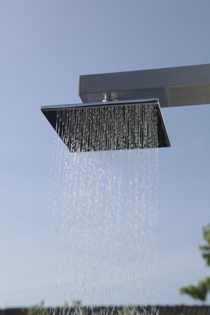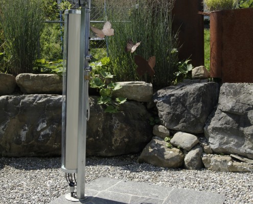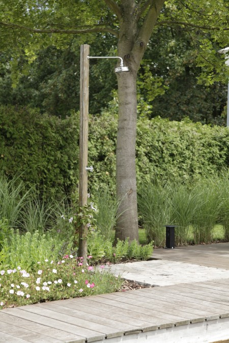 Eine Außendusche gehört zum Badevergnügen. Sich nach dem Sonnenbad, der Joggingrunde oder dem Saunagang abzukühlen, bevor es ins Becken geht, schont den Kreislauf und regt die Durchblutung der Haut an. Die Reinigung vor dem Bad fördert die Hygiene im Teich und vermindert die Nährstoffbelastung des Wassers, durch Partikel und Stoffe, die sich von der Haut lösen. Moderne Außenduschen sind funktionale Designobjekte aus Edelstahl oftmals kombiniert mit Holz oder Glas. Manche Modelle eignen sich für Warm- und Kaltwasser. Solarduschen fangen Sonnenenergie für mindestens einen warmen Duschgang ein. Die Dusche benötigt einen sicht- und windgeschützten Platz vor einer Duschabtrennung oder an der Hauswand. Auch eine dichte Hecke funktioniert wunderbar. Ablagen für Handtuch, Badebekleidung und Duschutensilien in unmittelbarer Nähe perfektionieren das Ganze. Achtung, die Duschtasse sollte zügig entwässern und unbedingt einen rutschfesten Steinboden haben. Duschwasser darf nicht in den Teich gelangen. Wenn es versickern soll, verwenden wir nur biologisch abbaubare Seife.