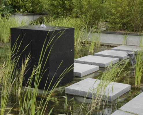 Gerade wenn in der Horizontalen wenig Platz ist, lohnt es sich, die Vertikale bei der Gartengestaltung mit einzubeziehen. Das gilt für alle Bestandteile im grünen Bereich und somit auch für ein Konzept mit Wasser. Wasserwände sind in diesem Zusammenhang eine recht neue Variante, um das erfrischende Nass in den Garten zu holen. Unabhängig von Größe oder Material bestehen sie aus einem Becken und einem Wandelement. Eine Pumpe befördert das Wasser aus dem Becken durch einen von außen unsichtbaren Schlauch nach oben, wo es dann gleichmäßig an der Wand wieder hinab ins Becken fließt.