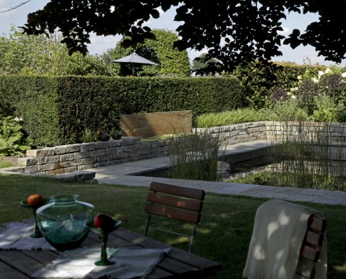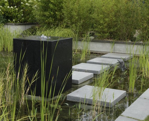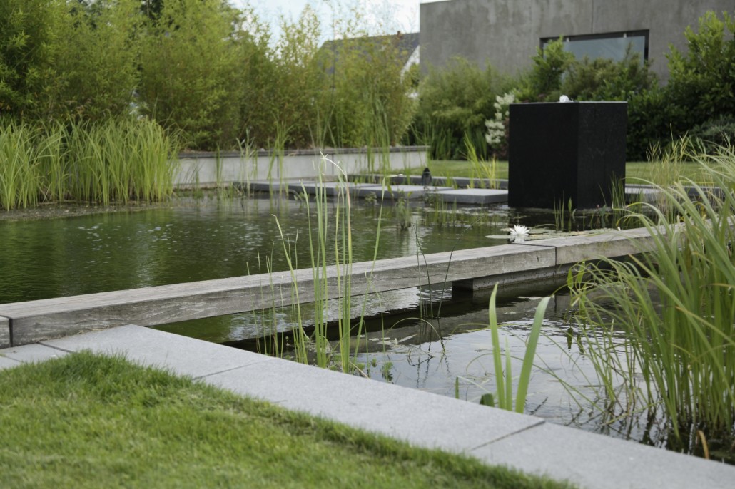 In enger Anlehnung an die Architektur wurde ein sehr formaler Entwurf für den Swimming-Teich entwickelt. Die Wasserfläche erhielt ein eigenes Niveau unterhalb der vorhanden Terrasse, das der Höhenentwicklung von Gelände und Wohngebäude entspricht. Über eine breite Natursteintreppe gelangt man zum Holzdeck und von dort direkt ins kühle Naß. Sogar aus dem Wasser hat man noch den Blick über den Rasen in die weite Landschaft. Regenerations- und Filterbereiche sind konsequent othogonal angelegt. Trittplatten und eine schwebende Holzbohle sind nicht nur Designelemente, die die Anlage gliedern, sie erleichtern auch den Zutritt für die regelmäßige Säuberung des 1,90 m tiefen Schwimmbereichs. Das Ziel der langen Blickachse aus dem verglasten Wohzimmer über den Swimming Pond hinweg bildet ein besonders repräsentativer Quellblock aus poliertem schwarzem Granit. Durch die enge Verzahnung von Architektur mit Außenraum und Swimming Pond ist ein außergewöhnliches Ensemble entstanden, das die hohen Ansprüche der Besitzer an Form und Funktion vollends erfüllt.