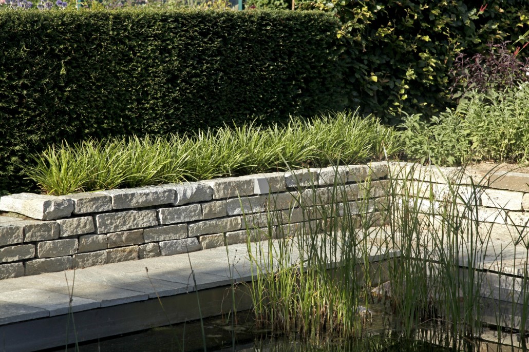 Der Swimming Pond passt perfekt ins orthogonale Grundmuster des Gartens und nimmt dessen Formensprache auf. Eine spannende Serie von Tritten aus historischem Sandstein der Region trennt die Regenerationszone vom Schwimmbereich. Vom Sonnendeck gelangt man über eine bequeme Holztreppe auf das Stehpodest, um sich dort langsam abzukühlen. Von hier aus gleitet man langsam weiter ins tiefe Wasser und zieht genüsslich seine Bahnen.