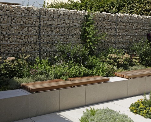 Die Lösung bestand darin, mittels an der Grundstücksgrenze errichteten Gabionenwänden einen Hof zu bilden, der Geborgenheit bietet. Ein Wasserfall fällt aus der Wand in ein Becken und erzeugt ein angenehmes gleichmäßiges Hintergrundgeräusch. Das Ohr der Gartenbewohner wird dadurch so abgelenkt, daß sie der Umgebungslärm nun nicht mehr stört.